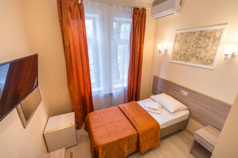 Площадь номера - 16 кв.м. 1 осн. место. 1 доп. место. Мебель: вешалка, зеркало, кровать односпальная, прикроватная тумбочка, стол, стул, шкаф. Оборудование: сплит-система, телевизор, холодильник. Санузел: с душем, туалетные принадлежности, фен. Сервис: Wi-Fi бесплатно, смена полотенец (1 раз в 3 дня), смена постельного белья (1 раз в 5 дней), уборка номера (ежедневно).
