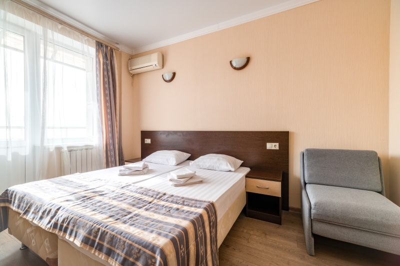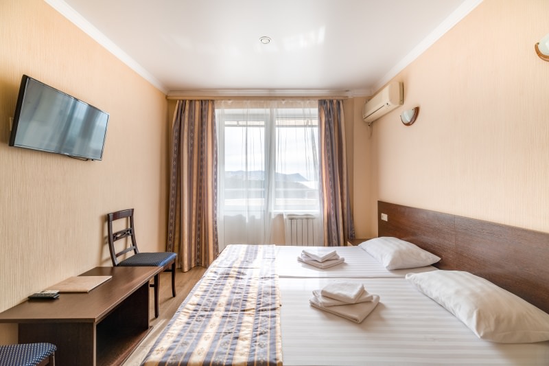 Площадь номера - 18 кв.м. 2 осн. места. Мебель: вешалка, зеркало, кровати односпальные, прикроватные тумбочки, стол, стулья, шкаф. Оборудование: сплит-система, телевизор, холодильник. Санузел: с душем (поддон), туалетные принадлежности, фен. Сервис: Wi-Fi бесплатно, смена полотенец (1 раз в 3 дня), смена постельного белья (1 раз в 5 дней), уборка номера.