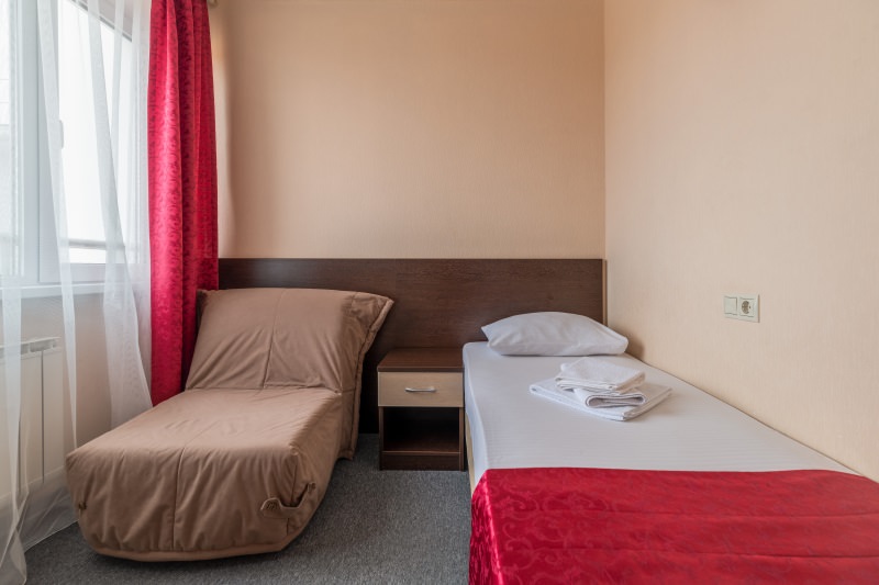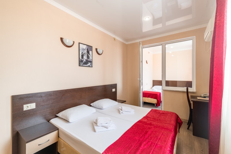 Площадь номера - 30 кв.м. 3 осн. места. 1 доп. место. Мебель: вешалка, зеркало, кровати односпальные (или одна двуспальная кровать и одна односпальная кровать), прикроватные тумбочки, стол, стулья, шкаф. Оборудование: сплит-система, телевизор, холодильник. Санузел: с душем, туалетные принадлежности, фен. Сервис: Wi-Fi бесплатно, смена полотенец (1 раз в 3 дня), смена постельного белья (1 раз в 5 дней), уборка номера (ежедневно).